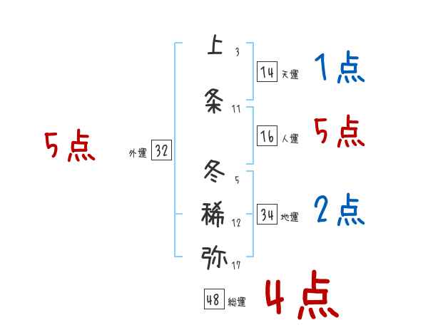 外運![]() | 上条冬稀弥さんの外運は32画の5つ星!柔軟性があり成功する。チャンスが多く金運が良い。 生活面を象徴する運勢です。外部から受ける影響力を表し、結婚運、家庭運や職場、環境への順応性を表します。 |