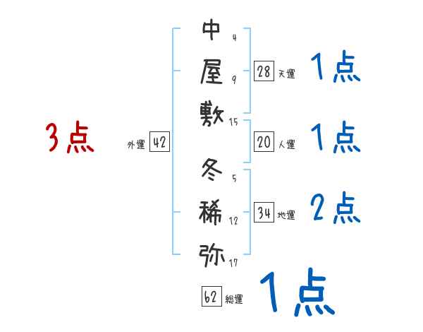 天運![]() | 中屋敷冬稀弥さんの天運は28画の1つ星!家庭環境に注意。スポーツで活躍できる能力があるかも。 家系が持つ宿命的な運勢を表します。祖先から受け継いだ苗字ですので自分の力が及びません。家柄を象徴します。 |