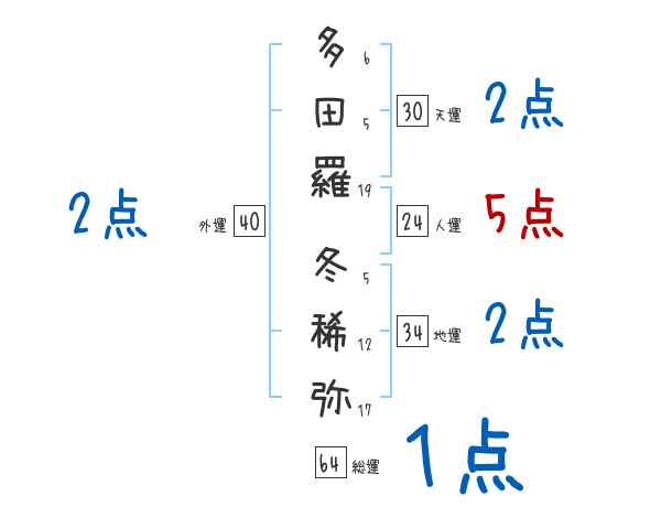 天運![]() | 多田羅冬稀弥さんの天運は30画の2つ星!浮き沈みの激しさに注意しましょう。 家系が持つ宿命的な運勢を表します。祖先から受け継いだ苗字ですので自分の力が及びません。家柄を象徴します。 |
