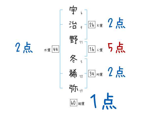 天運![]() | 宇治野冬稀弥さんの天運は26画の2つ星!波瀾万丈かも。信頼できる人を大事にしましょう。 家系が持つ宿命的な運勢を表します。祖先から受け継いだ苗字ですので自分の力が及びません。家柄を象徴します。 |