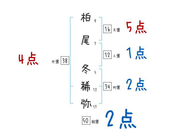 天運![]() | 柏尾冬稀弥さんの天運は16画の5つ星!人望が厚く大きく発展する。逆転成功が見える。 家系が持つ宿命的な運勢を表します。祖先から受け継いだ苗字ですので自分の力が及びません。家柄を象徴します。 |