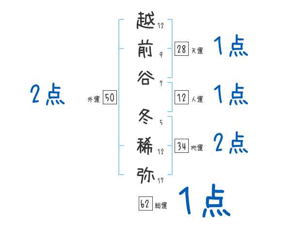 天運![]() | 越前谷冬稀弥さんの天運は28画の1つ星!家庭環境に注意。スポーツで活躍できる能力があるかも。 家系が持つ宿命的な運勢を表します。祖先から受け継いだ苗字ですので自分の力が及びません。家柄を象徴します。 |