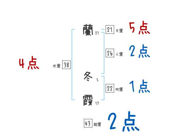 天運![]() | 蘭冬霞さんの天運は21画の5つ星!統率力がある。独立し成功する。名誉を手に入れる。 家系が持つ宿命的な運勢を表します。祖先から受け継いだ苗字ですので自分の力が及びません。家柄を象徴します。 |