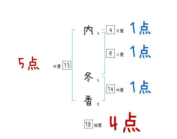 外運![]() | 内冬香さんの外運は13画の5つ星!才能に恵まれ人気がある。名声を手に入れる。円満な人生。 生活面を象徴する運勢です。外部から受ける影響力を表し、結婚運、家庭運や職場、環境への順応性を表します。 |