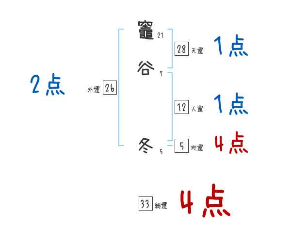天運![]() | 竈谷冬さんの天運は28画の1つ星!家庭環境に注意。スポーツで活躍できる能力があるかも。 家系が持つ宿命的な運勢を表します。祖先から受け継いだ苗字ですので自分の力が及びません。家柄を象徴します。 |