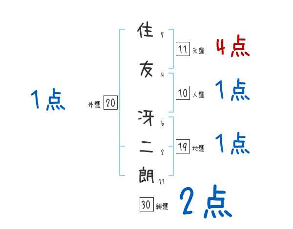 | 天運  | 住友冴二朗さんの天運は11画の4つ星!着実に富や地位を得る幸運な人生。家系が持つ宿命的な運勢を表します。祖先から受け継いだ苗字ですので自分の力が及びません。家柄を象徴します。 |