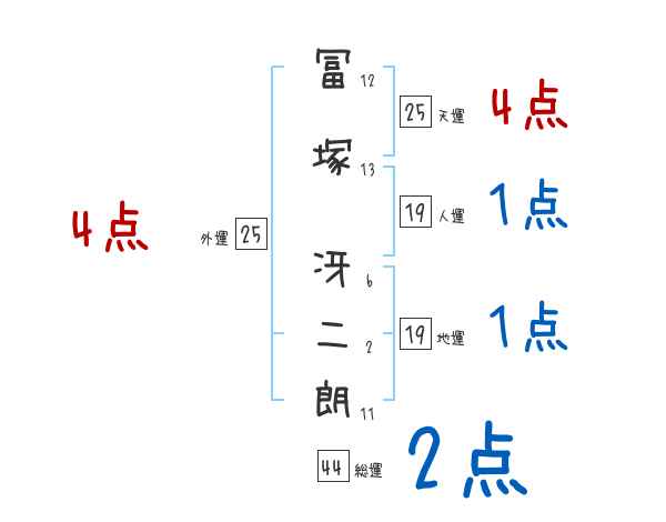 総運![]() | 冨塚冴二朗さんの総運は44画の2つ星!誠実で慎重な性格。物事を考えすぎないように注意しましょう。 あなたの人生を表す1番重要な運勢です。生涯を通じて影響する総合運となり、主に50歳以降の晩年期に影響を及ぼします。 |