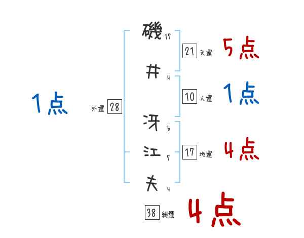 天運![]() | 磯井冴江夫さんの天運は21画の5つ星!統率力がある。独立し成功する。名誉を手に入れる。 家系が持つ宿命的な運勢を表します。祖先から受け継いだ苗字ですので自分の力が及びません。家柄を象徴します。 |