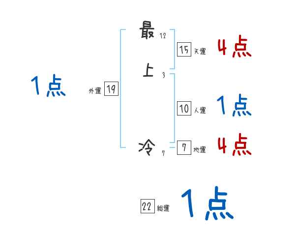 総運![]() | 最上冷さんの総運は22画の1つ星!努力することが苦手ないっぽう手先が器用。芸術性にも優れる。 あなたの人生を表す1番重要な運勢です。生涯を通じて影響する総合運となり、主に50歳以降の晩年期に影響を及ぼします。 |