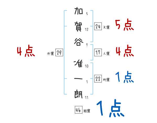 天運![]() | 加賀谷准一朗さんの天運は24画の5つ星!家庭運が良く順調な人生。金運にも恵まれる。 家系が持つ宿命的な運勢を表します。祖先から受け継いだ苗字ですので自分の力が及びません。家柄を象徴します。 |