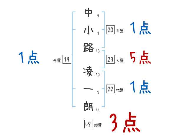 人運![]() | 中小路凌一朗さんの人運は23画の5つ星!想像力に優れ活力がある。一代で成功し名誉を手に入れる。 性格や才能などを表す2番目に重要な運勢です。人間関係や協調性、社会的な成功に影響します。主に20歳から50歳ぐらいまでの中年期の運勢を表します。 |