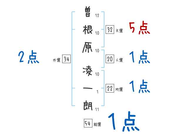 天運![]() | 曽根原凌一朗さんの天運は32画の5つ星!柔軟性があり成功する。チャンスが多く金運が良い。 家系が持つ宿命的な運勢を表します。祖先から受け継いだ苗字ですので自分の力が及びません。家柄を象徴します。 |