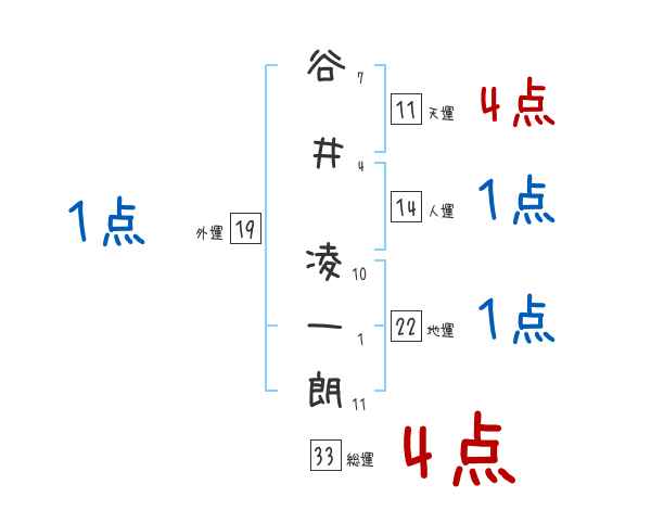 天運![]() | 谷井凌一朗さんの天運は11画の4つ星!着実に富や地位を得る幸運な人生。 家系が持つ宿命的な運勢を表します。祖先から受け継いだ苗字ですので自分の力が及びません。家柄を象徴します。 |