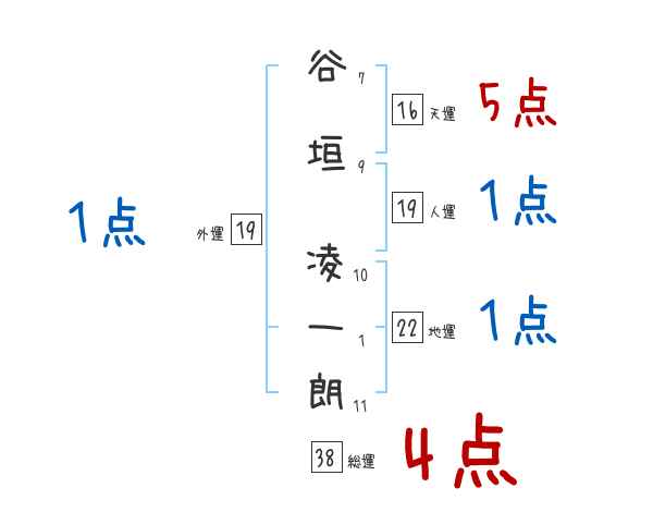 外運![]() | 谷垣凌一朗さんの外運は19画の1つ星!優れた才能を持ちますが、協調性が足りないことも。周りの人と協力する事を意識しましょう。 生活面を象徴する運勢です。外部から受ける影響力を表し、結婚運、家庭運や職場、環境への順応性を表します。 |