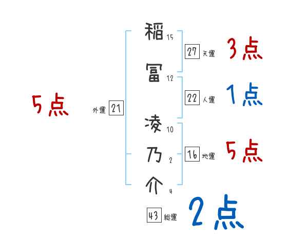 外運![]() | 稲冨凌乃介さんの外運は21画の5つ星!統率力がある。独立し成功する。名誉を手に入れる。 生活面を象徴する運勢です。外部から受ける影響力を表し、結婚運、家庭運や職場、環境への順応性を表します。 |