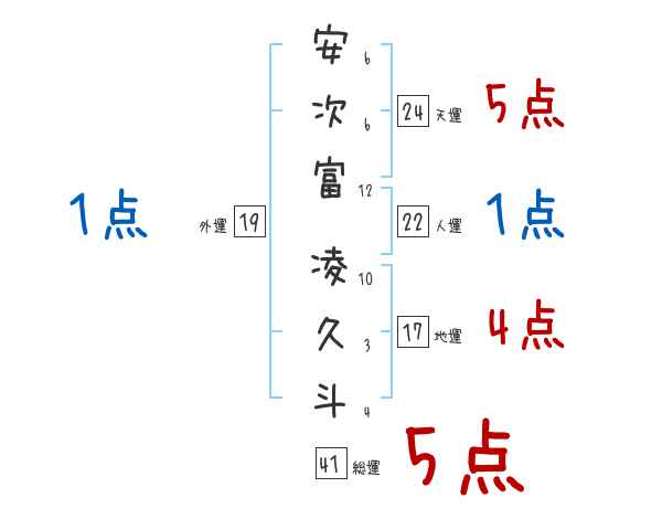 天運![]() | 安次富凌久斗さんの天運は24画の5つ星!家庭運が良く順調な人生。金運にも恵まれる。 家系が持つ宿命的な運勢を表します。祖先から受け継いだ苗字ですので自分の力が及びません。家柄を象徴します。 |