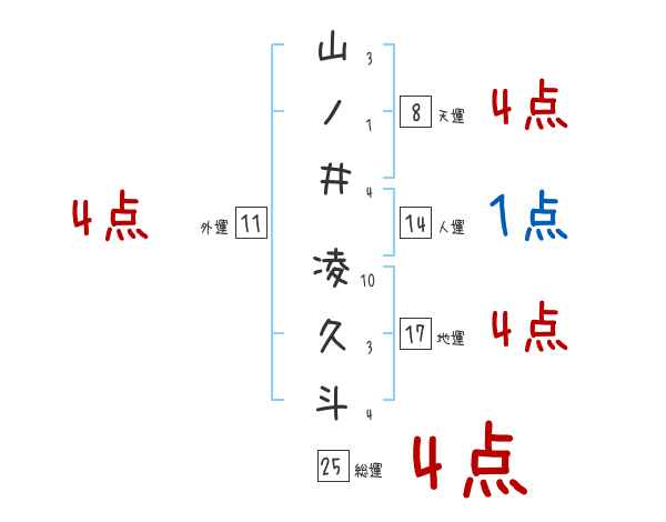 外運![]() | 山ノ井凌久斗さんの外運は11画の4つ星!着実に富や地位を得る幸運な人生。 生活面を象徴する運勢です。外部から受ける影響力を表し、結婚運、家庭運や職場、環境への順応性を表します。 |