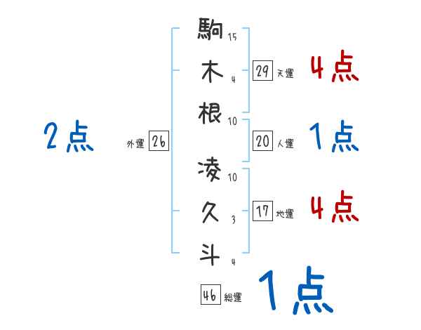 外運![]() | 駒木根凌久斗さんの外運は26画の2つ星!波瀾万丈かも。信頼できる人を大事にしましょう。 生活面を象徴する運勢です。外部から受ける影響力を表し、結婚運、家庭運や職場、環境への順応性を表します。 |
