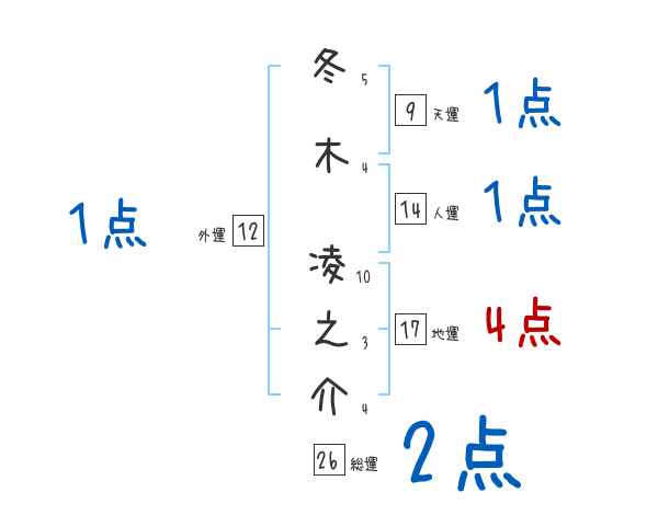 天運![]() | 冬木凌之介さんの天運は9画の1つ星!消極的で才能を発揮することが苦手なことも。周りの意見に耳を傾けましょう。 家系が持つ宿命的な運勢を表します。祖先から受け継いだ苗字ですので自分の力が及びません。家柄を象徴します。 |