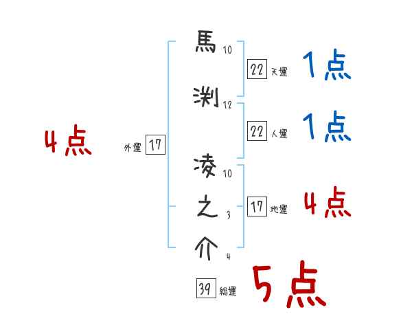 外運![]() | 馬渕凌之介さんの外運は17画の4つ星!積極的な行動力。地位を気づき財産を手に入れる。純粋な心と直感力。 生活面を象徴する運勢です。外部から受ける影響力を表し、結婚運、家庭運や職場、環境への順応性を表します。 |