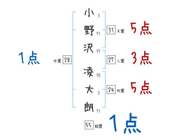天運![]() | 小野沢凌大朗さんの天運は31画の5つ星!社交性があり判断力に優れる。順風満帆な人生で円満な生活。 家系が持つ宿命的な運勢を表します。祖先から受け継いだ苗字ですので自分の力が及びません。家柄を象徴します。 |