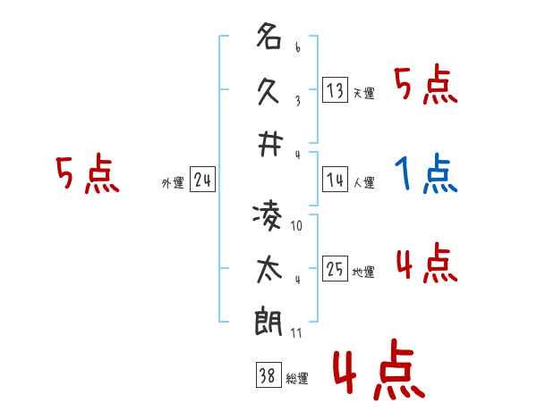 外運![]() | 名久井凌太朗さんの外運は24画の5つ星!家庭運が良く順調な人生。金運にも恵まれる。 生活面を象徴する運勢です。外部から受ける影響力を表し、結婚運、家庭運や職場、環境への順応性を表します。 |