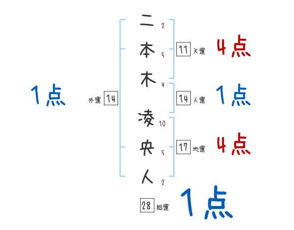 総運![]() | 二本木凌央人さんの総運は28画の1つ星!家庭環境に注意。スポーツで活躍できる能力があるかも。 あなたの人生を表す1番重要な運勢です。生涯を通じて影響する総合運となり、主に50歳以降の晩年期に影響を及ぼします。 |