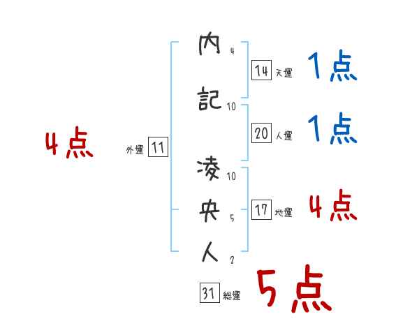 天運![]() | 内記凌央人さんの天運は14画の1つ星!人に対して優しいがストレスを溜め込みがち。人間関係のトラブルを避けるよう気をつけましょう。 家系が持つ宿命的な運勢を表します。祖先から受け継いだ苗字ですので自分の力が及びません。家柄を象徴します。 |