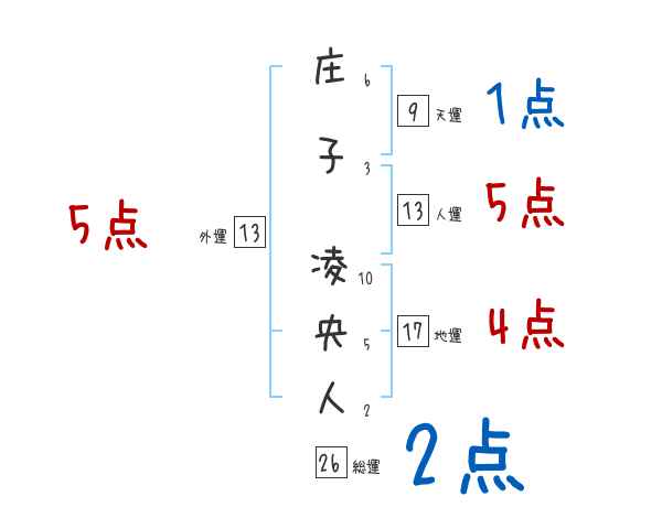 人運![]() | 庄子凌央人さんの人運は13画の5つ星!才能に恵まれ人気がある。名声を手に入れる。円満な人生。 性格や才能などを表す2番目に重要な運勢です。人間関係や協調性、社会的な成功に影響します。主に20歳から50歳ぐらいまでの中年期の運勢を表します。 |