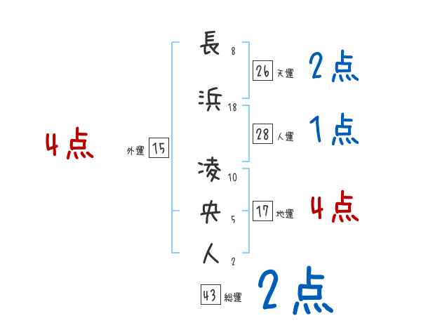 | 天運  | 長浜凌央人さんの天運は26画の2つ星!波瀾万丈かも。信頼できる人を大事にしましょう。家系が持つ宿命的な運勢を表します。祖先から受け継いだ苗字ですので自分の力が及びません。家柄を象徴します。 |
