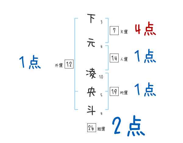 天運![]() | 下元凌央斗さんの天運は7画の4つ星!強い意志や信念を持ち独立心が強い。自立する。 家系が持つ宿命的な運勢を表します。祖先から受け継いだ苗字ですので自分の力が及びません。家柄を象徴します。 |