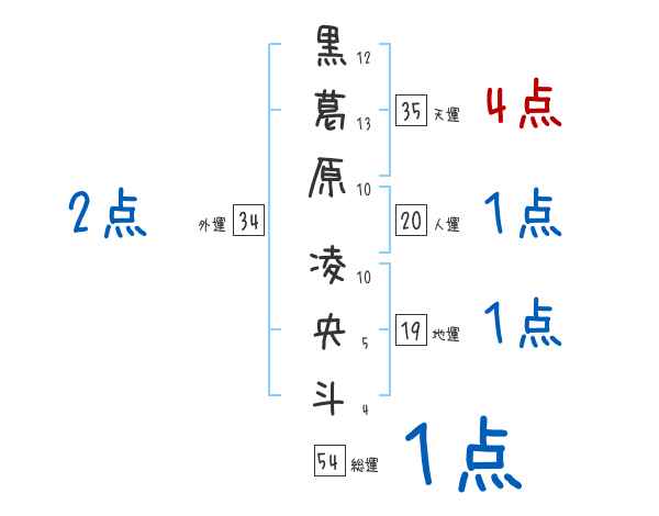 天運![]() | 黒葛原凌央斗さんの天運は35画の4つ星!温厚な性格で感受性が高い。穏和な性格で人望が厚い。 家系が持つ宿命的な運勢を表します。祖先から受け継いだ苗字ですので自分の力が及びません。家柄を象徴します。 |