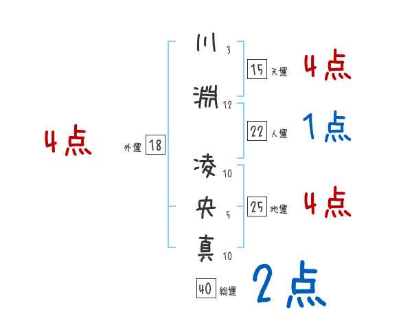 天運![]() | 川淵凌央真さんの天運は15画の4つ星!人徳があり出世する。順調に物事を進め円満な人生。 家系が持つ宿命的な運勢を表します。祖先から受け継いだ苗字ですので自分の力が及びません。家柄を象徴します。 |