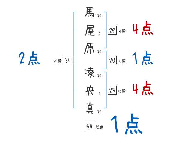 天運![]() | 馬屋原凌央真さんの天運は29画の4つ星!完全主義で才能がある。厳格な心の持ち主。 家系が持つ宿命的な運勢を表します。祖先から受け継いだ苗字ですので自分の力が及びません。家柄を象徴します。 |