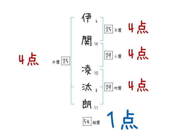 外運![]() | 伊関凌汰朗さんの外運は25画の4つ星!個性があり才能があふれる。強運の持ち主で発展する。 生活面を象徴する運勢です。外部から受ける影響力を表し、結婚運、家庭運や職場、環境への順応性を表します。 |