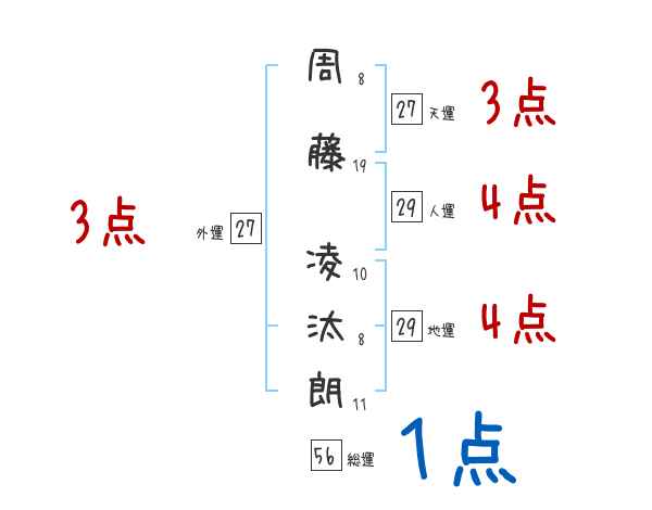 人運![]() | 周藤凌汰朗さんの人運は29画の4つ星!完全主義で才能がある。厳格な心の持ち主。 性格や才能などを表す2番目に重要な運勢です。人間関係や協調性、社会的な成功に影響します。主に20歳から50歳ぐらいまでの中年期の運勢を表します。 |