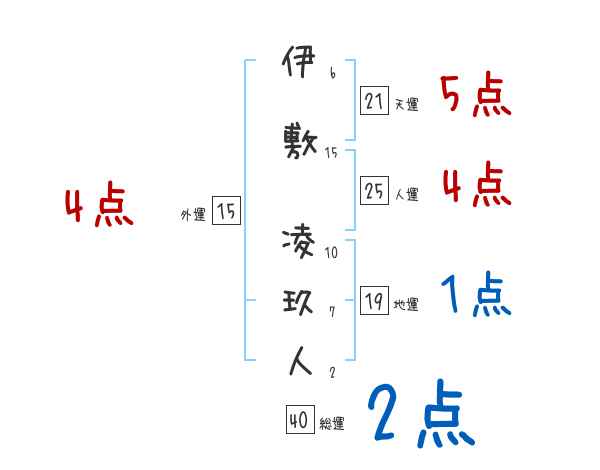 総運![]() | 伊敷凌玖人さんの総運は40画の2つ星!自信過剰で物事に固執するためトラブルに注意。 あなたの人生を表す1番重要な運勢です。生涯を通じて影響する総合運となり、主に50歳以降の晩年期に影響を及ぼします。 |