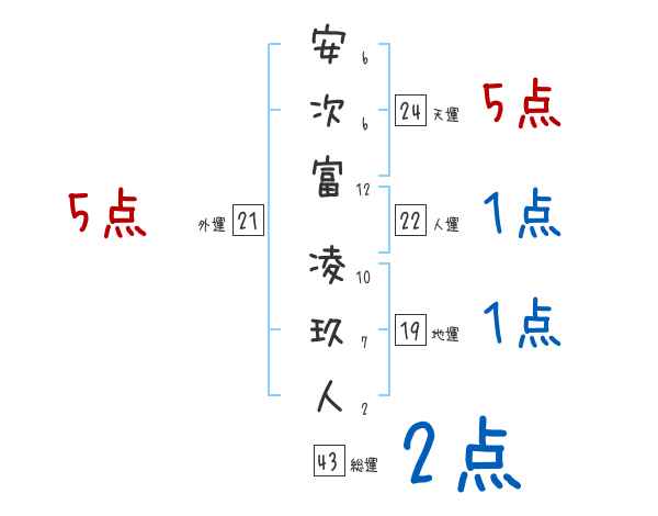 外運![]() | 安次富凌玖人さんの外運は21画の5つ星!統率力がある。独立し成功する。名誉を手に入れる。 生活面を象徴する運勢です。外部から受ける影響力を表し、結婚運、家庭運や職場、環境への順応性を表します。 |