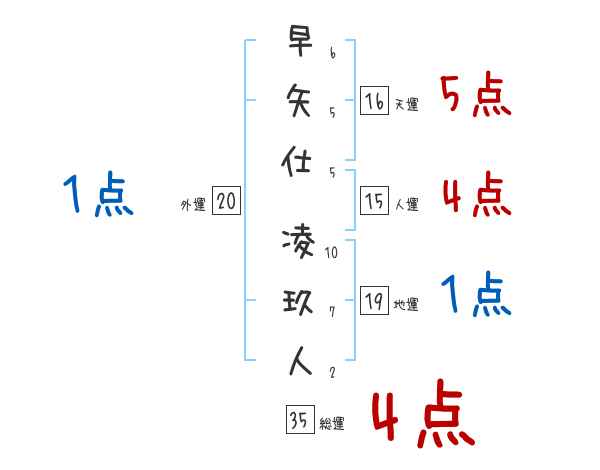 天運![]() | 早矢仕凌玖人さんの天運は16画の5つ星!人望が厚く大きく発展する。逆転成功が見える。 家系が持つ宿命的な運勢を表します。祖先から受け継いだ苗字ですので自分の力が及びません。家柄を象徴します。 |