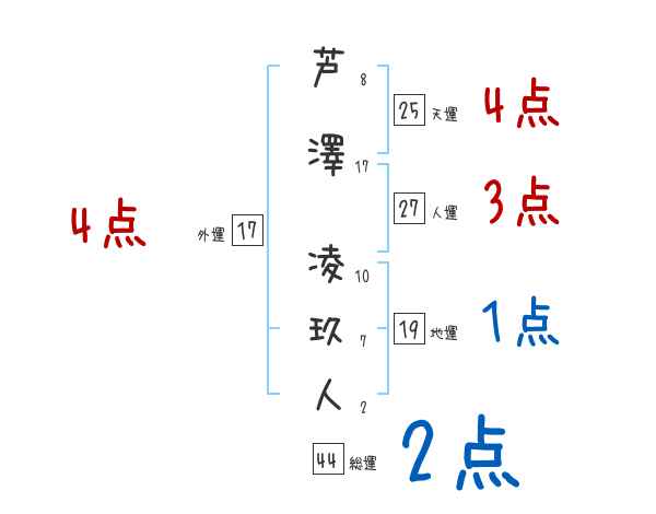 | 外運  | 芦澤凌玖人さんの外運は17画の4つ星!積極的な行動力。地位を気づき財産を手に入れる。純粋な心と直感力。生活面を象徴する運勢です。外部から受ける影響力を表し、結婚運、家庭運や職場、環境への順応性を表します。 |