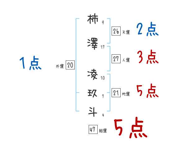 天運![]() | 柿澤凌玖斗さんの天運は26画の2つ星!波瀾万丈かも。信頼できる人を大事にしましょう。 家系が持つ宿命的な運勢を表します。祖先から受け継いだ苗字ですので自分の力が及びません。家柄を象徴します。 |