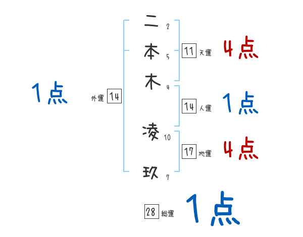 天運![]() | 二本木凌玖さんの天運は11画の4つ星!着実に富や地位を得る幸運な人生。 家系が持つ宿命的な運勢を表します。祖先から受け継いだ苗字ですので自分の力が及びません。家柄を象徴します。 |