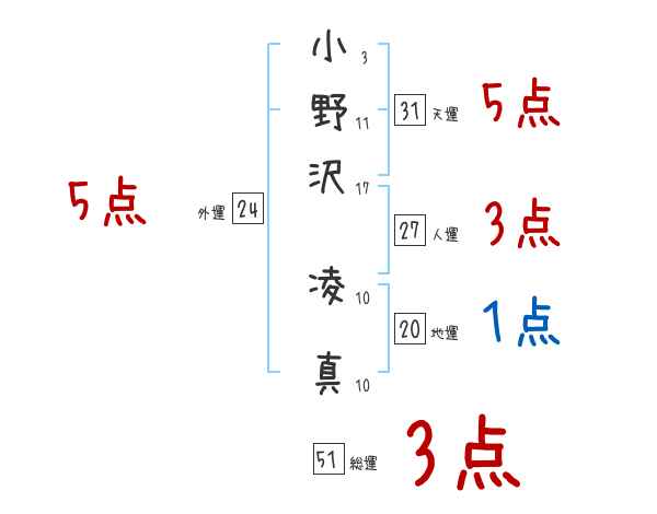 外運![]() | 小野沢凌真さんの外運は24画の5つ星!家庭運が良く順調な人生。金運にも恵まれる。 生活面を象徴する運勢です。外部から受ける影響力を表し、結婚運、家庭運や職場、環境への順応性を表します。 |