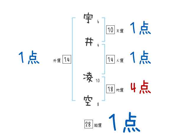 外運![]() | 宇井凌空さんの外運は14画の1つ星!人に対して優しいがストレスを溜め込みがち。人間関係のトラブルを避けるよう気をつけましょう。 生活面を象徴する運勢です。外部から受ける影響力を表し、結婚運、家庭運や職場、環境への順応性を表します。 |