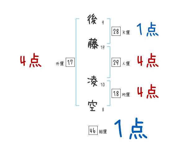 天運![]() | 後藤凌空さんの天運は28画の1つ星!家庭環境に注意。スポーツで活躍できる能力があるかも。 家系が持つ宿命的な運勢を表します。祖先から受け継いだ苗字ですので自分の力が及びません。家柄を象徴します。 |