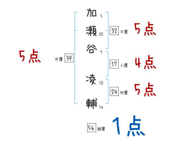 天運![]() | 加瀬谷凌輔さんの天運は32画の5つ星!柔軟性があり成功する。チャンスが多く金運が良い。 家系が持つ宿命的な運勢を表します。祖先から受け継いだ苗字ですので自分の力が及びません。家柄を象徴します。 |