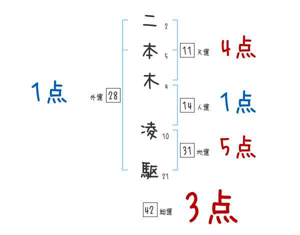 天運![]() | 二本木凌駆さんの天運は11画の4つ星!着実に富や地位を得る幸運な人生。 家系が持つ宿命的な運勢を表します。祖先から受け継いだ苗字ですので自分の力が及びません。家柄を象徴します。 |