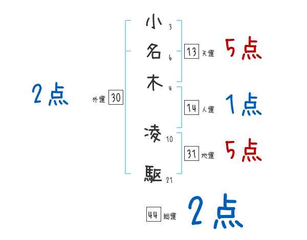 総運![]() | 小名木凌駆さんの総運は44画の2つ星!誠実で慎重な性格。物事を考えすぎないように注意しましょう。 あなたの人生を表す1番重要な運勢です。生涯を通じて影響する総合運となり、主に50歳以降の晩年期に影響を及ぼします。 |
