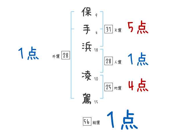 天運![]() | 保手浜凌駕さんの天運は31画の5つ星!社交性があり判断力に優れる。順風満帆な人生で円満な生活。 家系が持つ宿命的な運勢を表します。祖先から受け継いだ苗字ですので自分の力が及びません。家柄を象徴します。 |