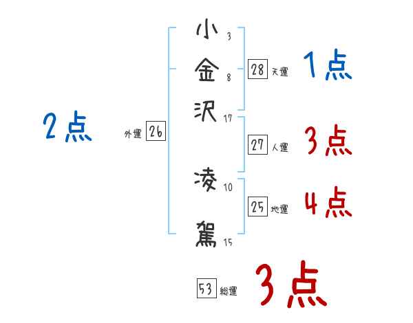 総運![]() | 小金沢凌駕さんの総運は53画の3つ星!やや見栄っ張りで虚栄心がある。散財に注意。 あなたの人生を表す1番重要な運勢です。生涯を通じて影響する総合運となり、主に50歳以降の晩年期に影響を及ぼします。 |